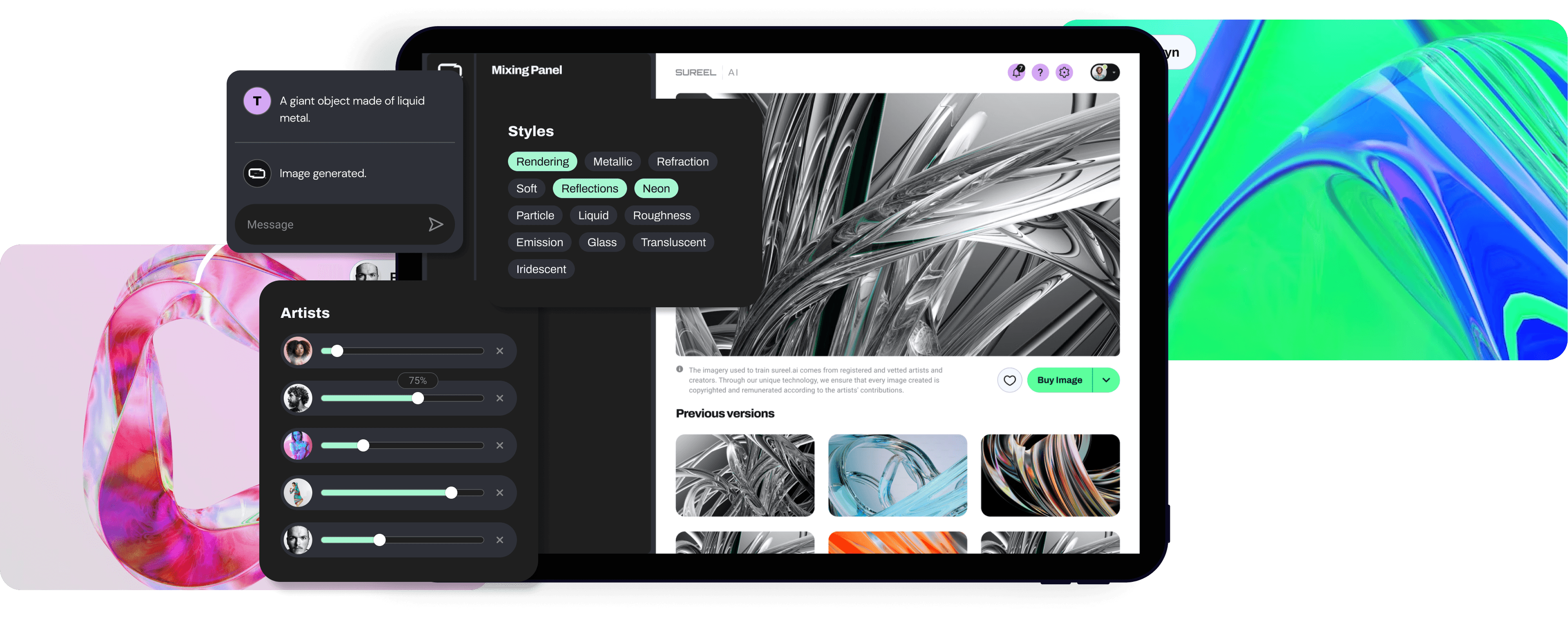 At Sureel.ai, we're leveraging the transformative power of generative AI to enable the creation of unique art pieces from existing works. Our AI technology learns from uploaded works, generating new pieces that bear the original artist's creative signature.